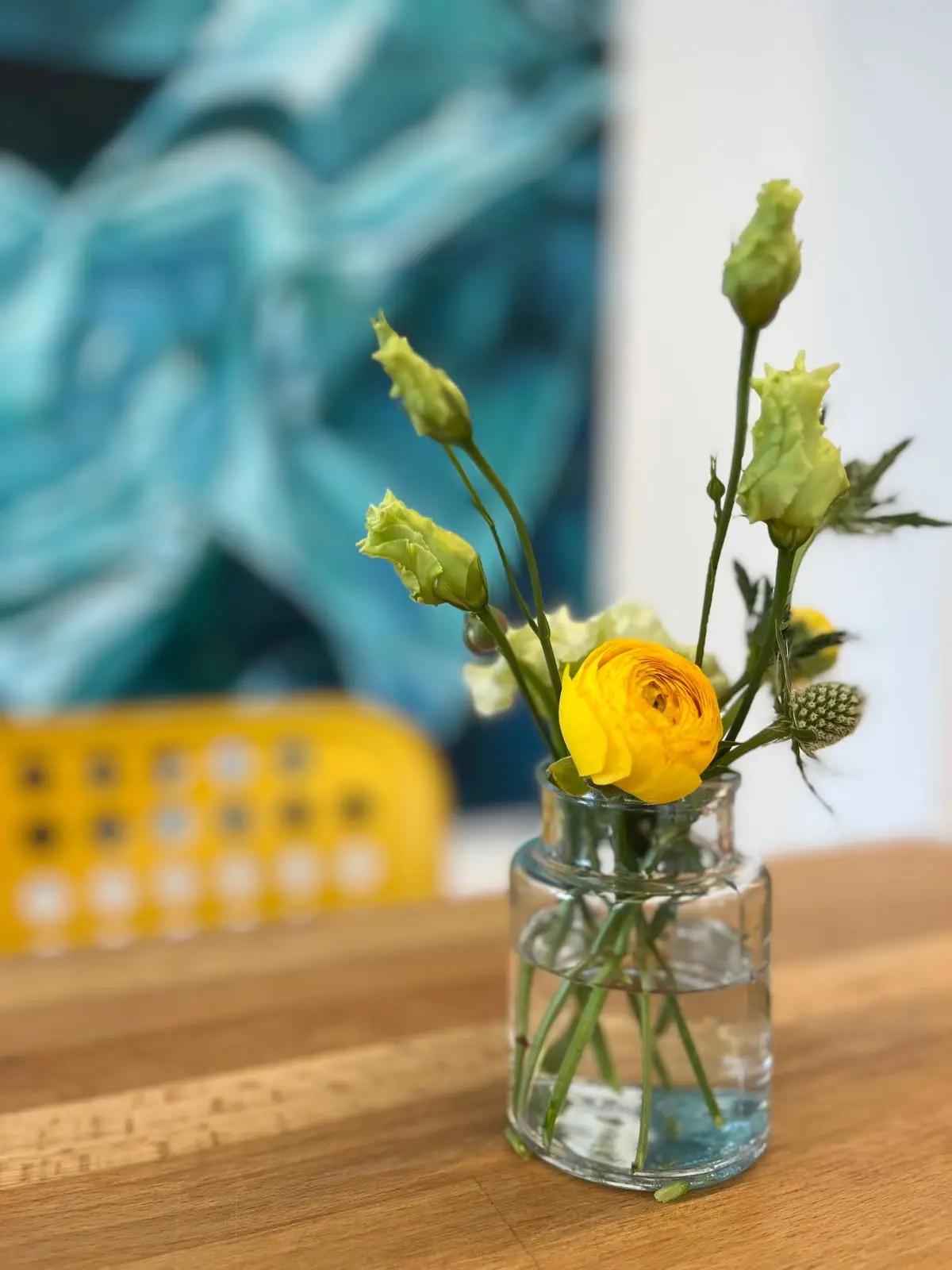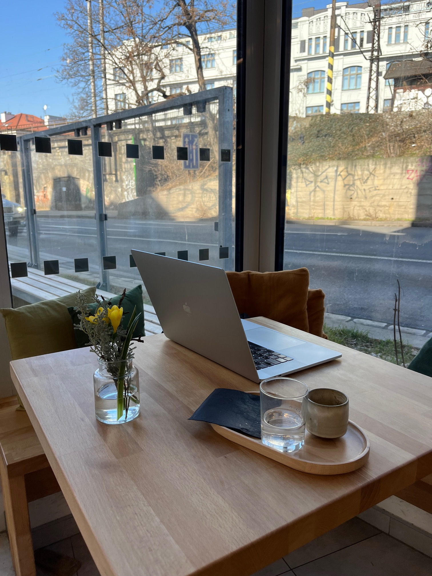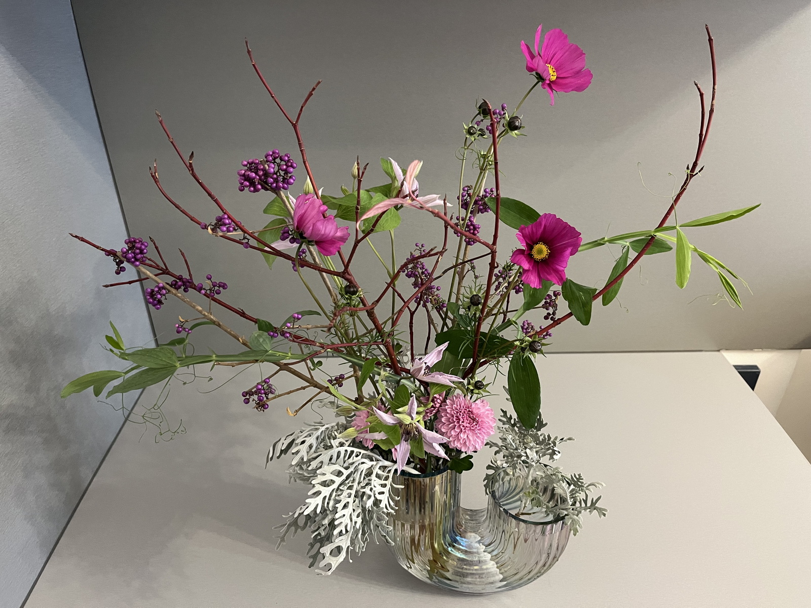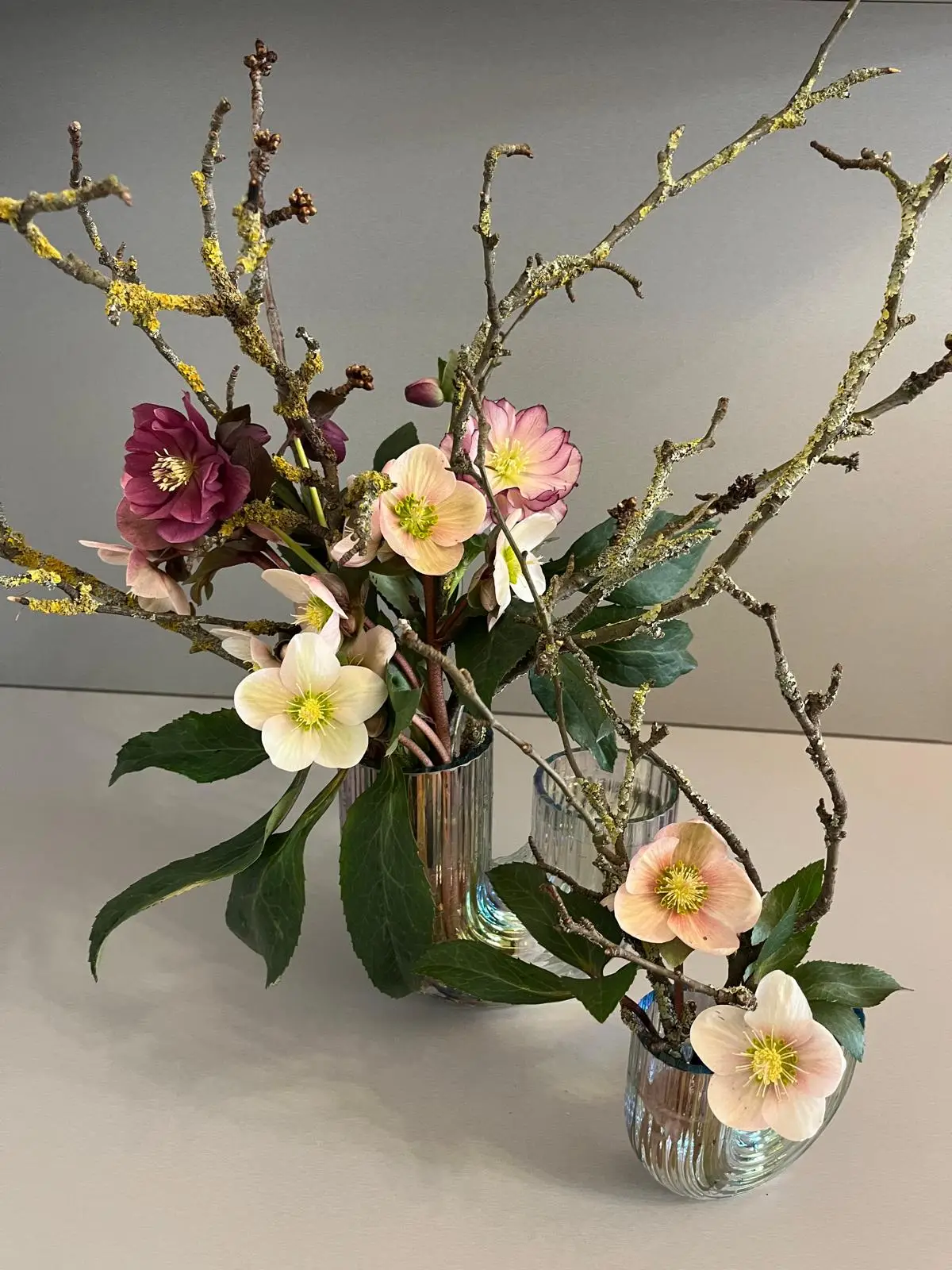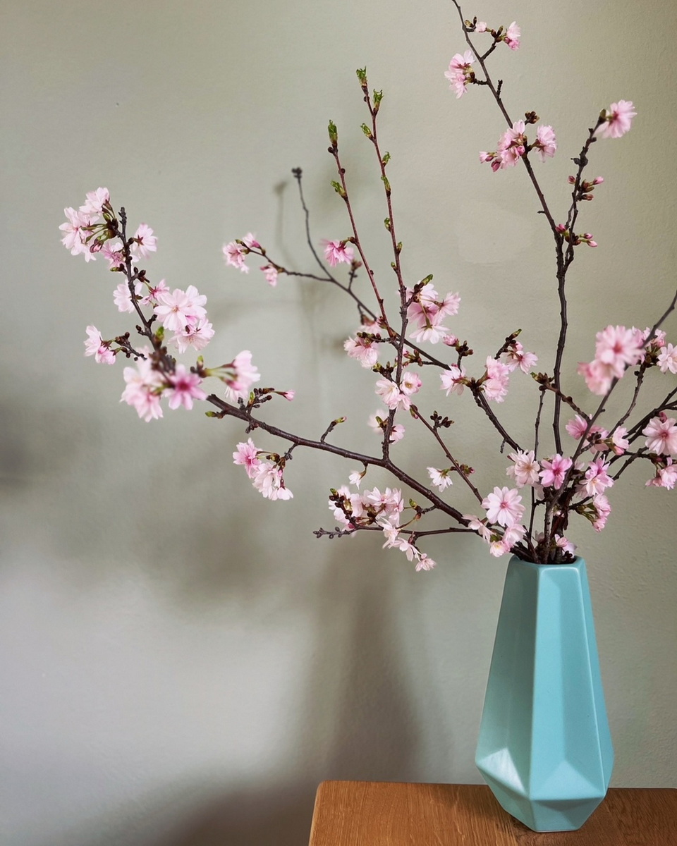 Kytky a větve od Kateřiny ve studiu máme už několik měsíců a dělají nám radost. Kytku beru trochu jako sochu, máme ji ve studiu ve výrazné váze na velkém špalku hned u vchodu a je velmi dominantní. Kombinace čerstvých, sezónních kytek s větvemi dělá celkový dojem jedinečný. Pro mě a pro moji práci je důležitá udržitelnost. Tím, že jsou kytky a větve převážně ze zahrady a ty staré si bere Kateřina na kompost, tak mi to zapadá do konceptu udržitelnosti a využití zdrojů kolem nás.